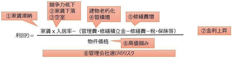 ワンルーム投資を行う際に考慮しなければならない主なリスク(=投資利回りを下げるもの)は以下の通りです。