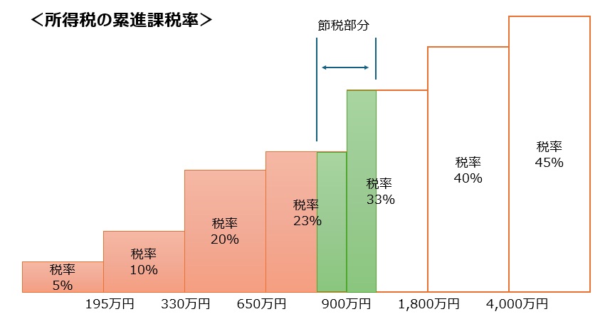 ワンルーム投資の節税は、給与所得から不動産所得(マイナスを想定)を控除することで所得を下げることで、すでに収めた税金の一部が還付されることを指します。例えば、給与所得が1200万円、不動産所得が▲400万円の場合、合算後の課税所得は800万円となり、税額が減少します。これが「節税効果」と呼ばれるものです。