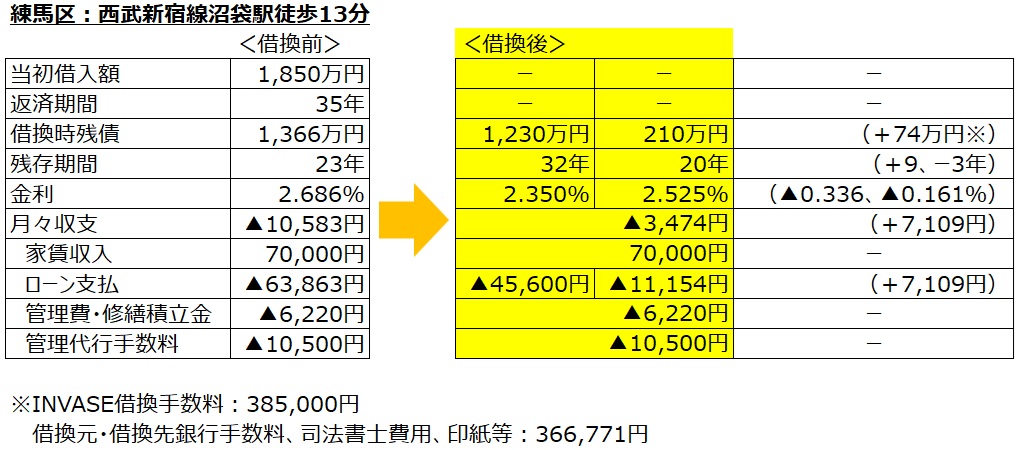 2013年に購入した練馬区沼袋駅徒歩13分の物件を借換した事例です。借換により重要なポイントは2点あります。1点目は借換前後の金利差(大きければ大きいほうが良い)。2点目は返済期間、購入時から12年が経過し残期間は23年となっていましたが、返済期間32年・20年で借換。月々の返済額は、金利が安ければ安いほど、返済期間が長ければ長いほど少なくなるため、返済期間32年間で纏めたかったのですが、今回は借換事例1(目黒区学芸大学)借換事例2(練馬区上石神井)借換事例3(目黒区洗足)のようにはいかず、物件の担保評価が残債を下回ったため、差額210万円は無担保ローン20年で借換することになりました。以下の通り収支は改善したので良しとします。