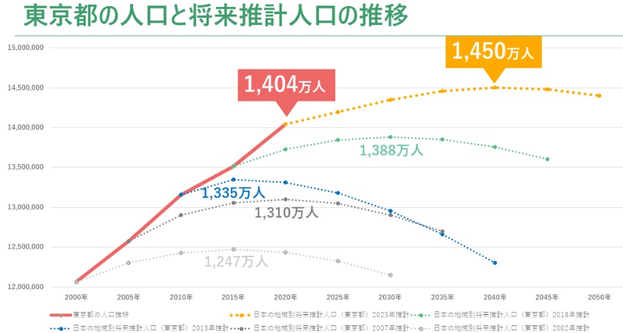 では、東京の将来の人口動態はどうかというと、興味深いデータがあります。以下の表は日本財託さんのホームページよりお借りしたものですが、2002年の推計では2015年頃に人口のピーク(1,247万人)を迎えることが予測されていましたが、時間の経過と共に予測が上方修正され、最新の2023年の推計では2040年頃にピーク(1,450万人)を迎えると予測されています。日本は2006年頃に人口のピークを迎え人口減時代に突入しましたが、東京は別です。