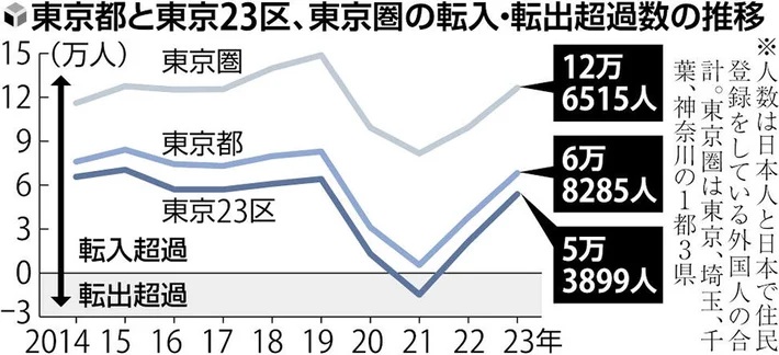 空室率を下げるために最も重要なのは立地。便利な場所に人が集まり、人が集まると都市の活性化に繋がりインフラ整備が進む。インフラ整備により都市の魅力が高まり更に人が集まるので自ずと空室リスクが下がる。同時に不動産価値の上昇に繋がり、賃料の上昇にも繋がる。以下は2024年1月31日の読売新聞の記事ですが、コロナ禍により一時的に東京圏への転入がマイナスとなりましたが、2022年以降は再びプラス圏に。2023年の東京都の転入超過68,285人のうち53,899人が東京23区への転入となっています。