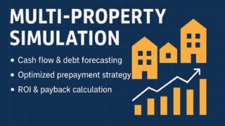 複数物件の不動産投資を一括でシミュレーション。繰上返済の最適化、未来物件の追加、ROI・CF・純資産・Payback達成年を自動計算できます。